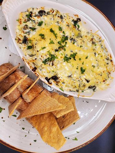 Spinach + artichoke hearts mixed with a blend of cheeses. served with baguette + local artisan flatbread crackers