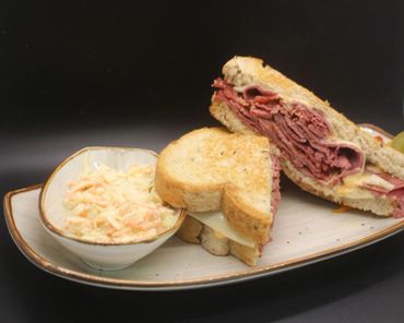 8oz of thinly sliced corned beef, sauerkraut, 1000 island, and Swiss. served on locally baked rye
